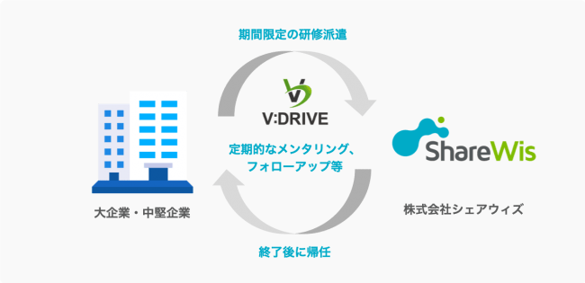 V:DRIVE (参考URL: https://www.sansokan.jp/innv-jinzai/ )は、大企業等から中小・ベンチャー企業への人材の流動化(人材育成を目的とした期間限定の研修派遣、兼業・副業での参画、転籍等)を促進することにより、次世代人材の育成や中小・ベンチャー企業の成長加速等を図ることを目的に、大阪市(事務局:公益財団法人大阪産業局ほか)が実施するプログラムです。次世代リーダーとしての活躍が期待される大企業の人材を対象に、ベンチャー企業での業務経験を通じた研修機会を提供する「短期派遣チャレンジプログラム」(参考URL: https://www.sansokan.jp/innv-jinzai/semi/semi02.html )を10月から開始(6カ月間)しています。