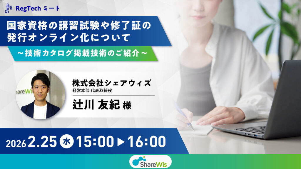 2月25日(水)15時よりデジタル庁主催のウェビナー「国家資格の講習試験や修了証の発行オンライン化について~技術カタログ掲載技術のご紹介~」に弊社代表の辻川が登壇いたします。