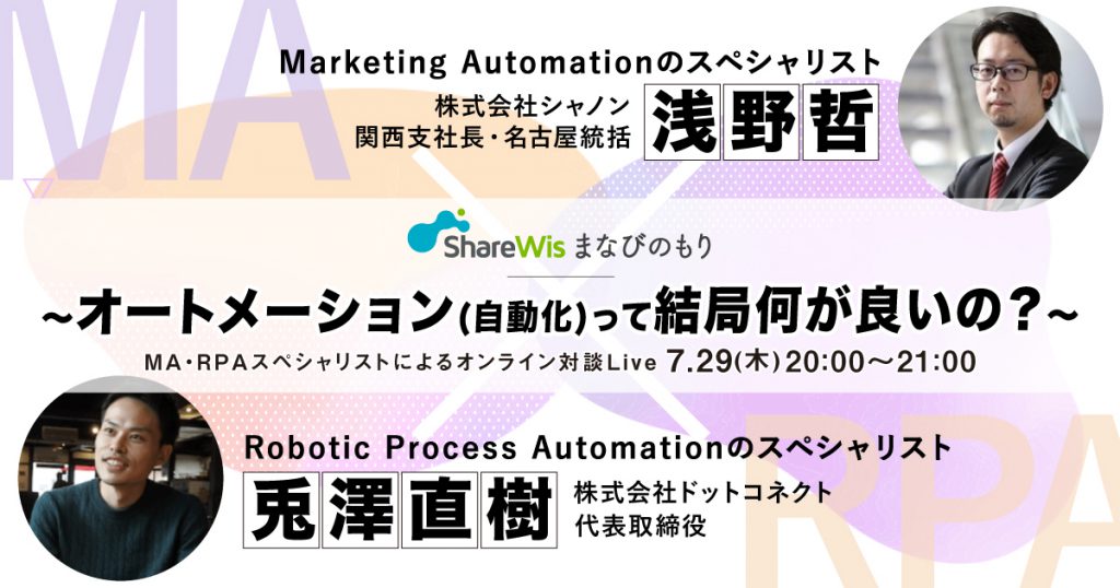 株式会社シェアウィズ マーケターの長江将史 がモデレーターを務め、「オートメーション(自動化)って結局何が良いの?」をテーマに、MA (Marketing Automation) のスペシャリストである株式会社シャノンの浅野哲 氏と、RPA (Robotic Process Automation)のスペシャリストである株式会社ドットコネクト 代表取締役の兎澤直樹氏、両専門家の頭の中を覗き見ることで、業務自動化・効率化の本質に迫る内容となります。