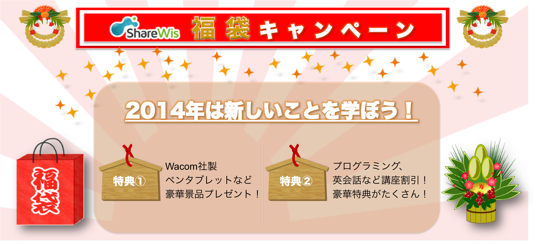 明けましておめでとうございます。 本年もどうぞよろしくお願い致します。 ShareWisでは、学んでお得がいっぱいもらえる「福袋キャンペーン」を開催致します。 プログラミングや英会話、プレゼンやボイトレなど、今年は新しい学びに挑戦してお得をゲットしませんか? ■キャンペーン概要 特典①:特定コースを完了させることでパートナー企業特典を獲得!オンライン外国語やプログラミングの割引クーポンなど10特典! 期間: 2014年1月1日(水)~1月14日(火) 条件: 特定コースの完了 特典②:期間内の学習レクチャー完了数上位者にワコム社製ペンタブレットなど豪華賞品をプレゼント! 期間: 2014年1月3日(金)~1月12日(日) 条件: キャンペーン期間内の学習レクチャーをより多く完了させる ※詳細は下記キャンペーンページをご参照 http://help.share-wis.com/fukubukuro-2014