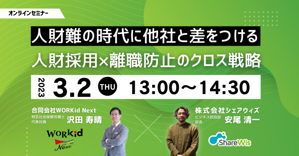 3月2日(木)13時より合同会社WORKid Nextとの共催セミナー「人財難の時代に他者と差をつける 人財採用×離職防止のクロス戦略セミナー」を開催します。