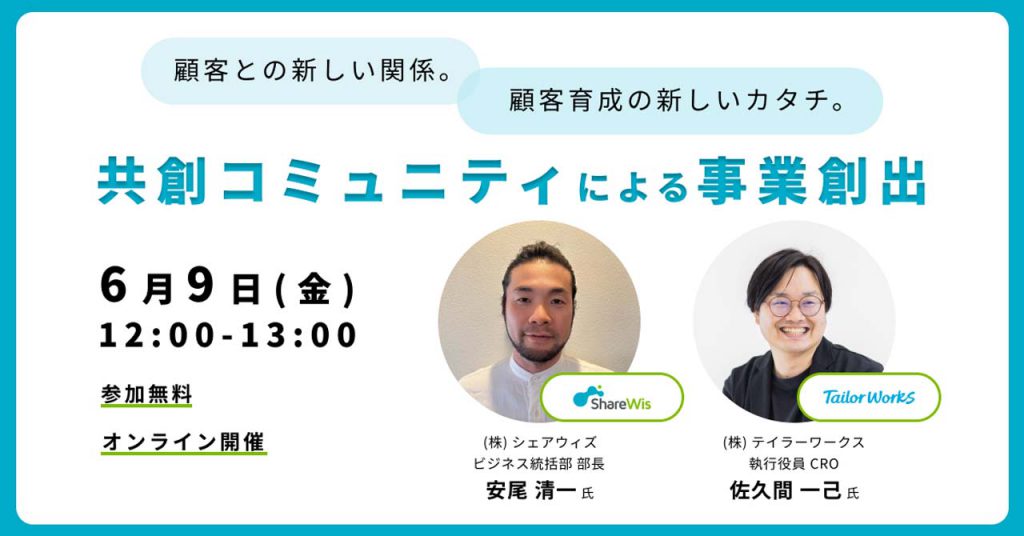 6月9日(金)12時より株式会社テイラーワークスと共催セミナー「顧客との新しい関係。顧客育成の新しいカタチ。 共創コミュニティによる事業創出」を開催します。