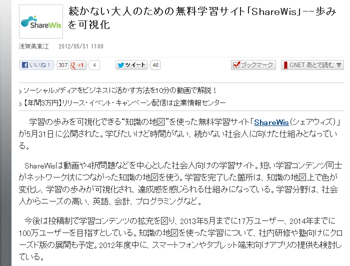 弊社サービスShareWisがCNET Japanに掲載されました。 誠にありがとうございます。 続かない大人のための無料学習サイト「ShareWis」—歩みを可視化