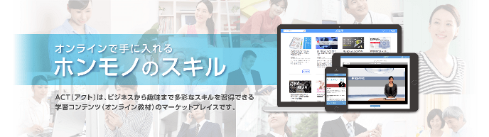 ACTは、動画、テキスト、クイズ形式のレクチャーがセットになったコースを購入して学ぶオンライン教材のマーケットプレイスです。スマホ、タブレット、PCに対応し、それぞれのレクチャーが短時間で完結しているので、場所や時間を選ばず学習者のライフスタイルに合わせて、本格的なスキルアップに取り組むことができます。掲載されているコースは各分野の専門家が作成したもので、ビジネスから趣味にまたがる多彩な分野をとりそろえています。リリースに合わせ、10月22日から11月4日までの14日間に~90%オフの記念セールを開催します。