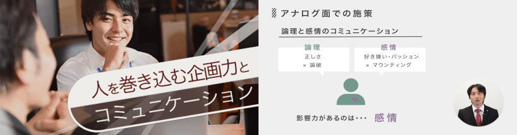 本コースでは、まずデータを活用し説得力のある企画の立て方を学びます。次にデータを使った業務の進め方や、メンバーとのコミュニケーションの取り方を論理と感情の2つの視点から学び、企画成功のためのコツを得ることができます。
