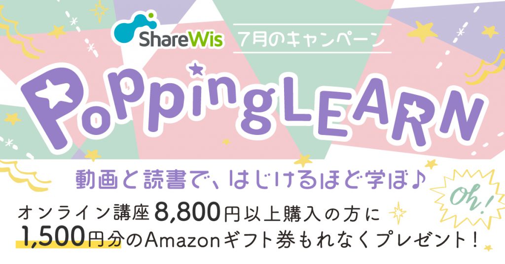 ShareWisの2021年7月度キャンペーン『Popping LEARN』を7/9(金)12:00より開始しました。今回のキャンペーンでは、7月中の期間限定でShareWisのプロコースを総額で税込み8,800円以上の購入が確認できたユーザー様に、もれなく1,500円分のAmazonギフト券を贈呈します。