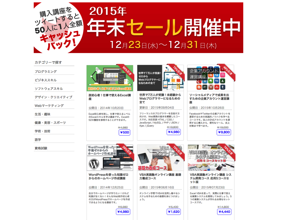 株式会社シェアウィズは、同社のオンライン教材マーケットプレイス「ShareWis ACT」において、新年に向けての新しい勉強スタートを応援する年末キャンペーンを開催。プログラミングなどのオンライン教材を最大90%オフで販売するとともに、購入講座をツイートすると50人に1人全額キャッシュバックのチャンスもある特別なキャンペーンを開始。期間は、12月31日まで。大人気の初心者向けプログラミング講座「世界で7万人が受講!ゼロからWebプログラマーになるための全て」など、人気コースが多数セール対象になっています。 ◼︎ShareWis ACT(シェアウィズ アクト) https://act.share-wis.com/